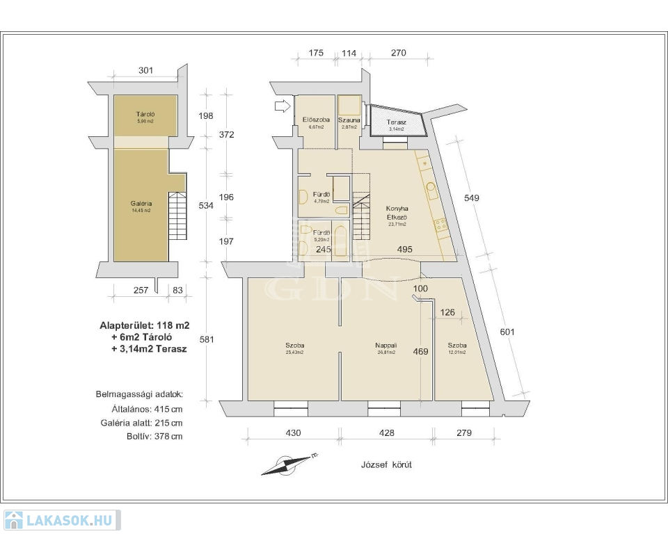 A terekben bővelkedő lakás két külön nyíló hálószobával, nappalival, konyha-étkezővel, álló galériával, két fürdőszobával továbbá tároló helységekkel, illetve tágas előszobával és belső udvarra néző erkéllyel (3,14 m2) rendelkezik.