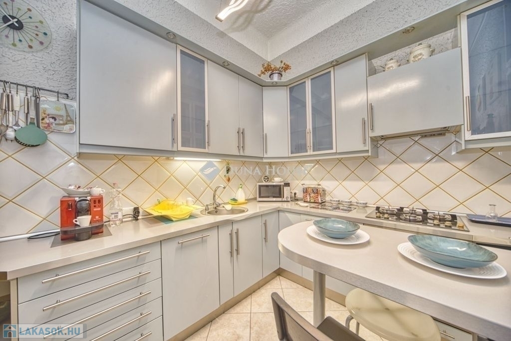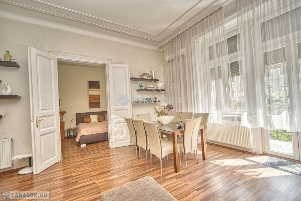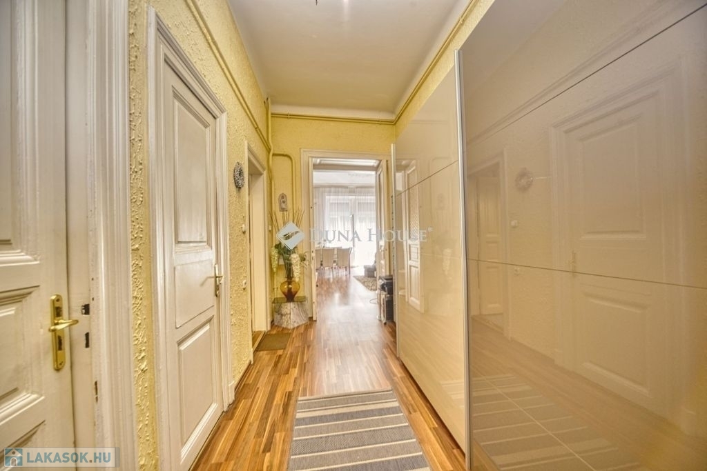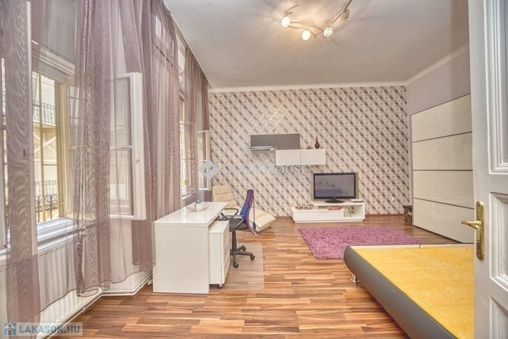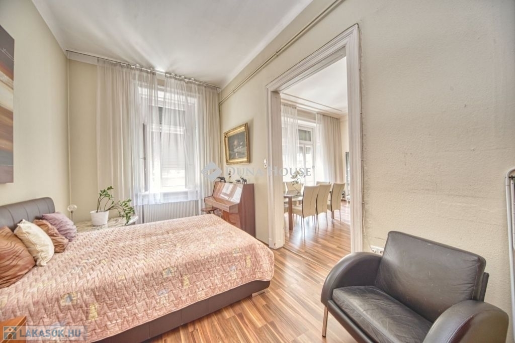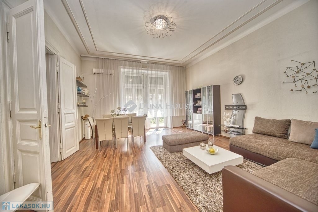 PALOTANEGYEDBEN!Mit ajánlok Önnek? A tökéletes belvárosi élet lehetőségét.A lakás Budapest VIII. kerületében, a Palotanegyedben, egy klasszikus, 1890-es években épült belvárosi épületben található.Az eklektikus stílusban épült társasház első emeletén egyedi adottságokkal rendelkező ingatlant ajánlok a figyelmébe.A környék kulturálisan gazdag és történelmi hangulatú, mely lakó- és üzleti célra is kiváló lehetőségeket kínál.A családi otthon 2015-ben esett át egy teljes felújításon ahogy ezt a képek is tökéletesen tükrözik.Ennek köszönhetően a konyha és a fürdőszoba felújítása megvalósult, a nappali ablaka már műanyag típusú nyílászárók vannak, elektromos redőnnyel ellátva. A hálószobai ablak is korszerű műanyag.A burkolatok újszerűek, a kellemes hőérzetről 2 db klíma gondoskodik.A 31 nm.es nappali a családi élet színtere, sőt erkély kapcsolatos is.A fűtés és a melegvíz ellátás cirkóról történik, a fűtés számla kb. havi 19,000, Ft.A közös költség 29,200, Ft, a lakás rezsije alacsony.A vételárrészét képezi a beépített gépesített konyhabútor, a 2 db klíma, a hálószobai gardrób szekrény, és a két nagyszekrény.Miért jó választás ez a lakás?A 107 m2-nek köszönhetően egy nagyon tágas lakásról beszélünk ennek köszönhetően tökéletes választás lehet családok részére, akár egy irodának is nagyon jól kialakítható az ingatlan.Világos a nagy ablakoknak köszönhetően, érezheti az egész napos természetes napfényt.Kiváló közlekedés néhány perc séta a 2-es metró, a 4-6-os villamos. Budapest bármely pontját, rövid időn belül elérhetjük.A környéken mindent megtalál, amit csak szeretne, éttermek, kávézok, bevásárlóhelyek csupán néhány perc sétára már meg is találhatja, amit szeretne.Ha bármi kérdése merülne fel hívjon fel bátran és szívesen állok rendelkezésére bármilyen kérdése van!Az ingatlan a Palotanegyed minden vonzó gasztronómiai, kulturális lehetőségéhez közel helyezkedik el.Belvárosi elhelyezkedés ellenére a lakás csendes és nyugodt környezetet biztosít. Ne hagyja ki ezt a ritka lehetőséget! Érezze át a tökéletes belvárosi életet hívjon még ma és nézze meg személyesen ezt a különleges lakást.