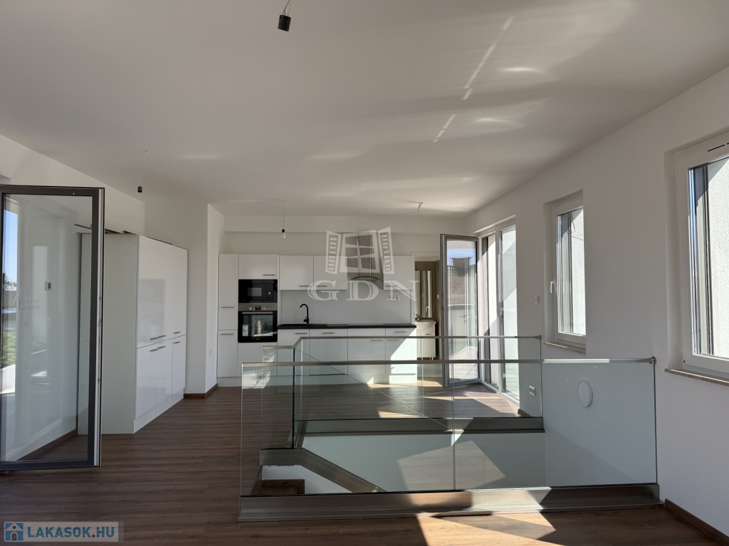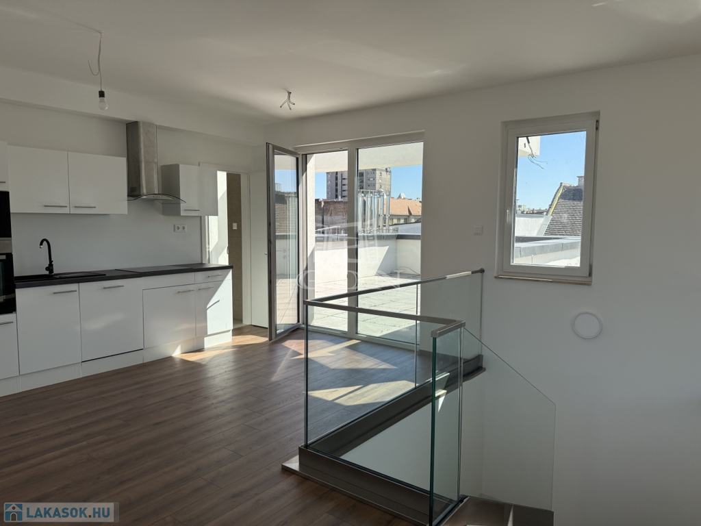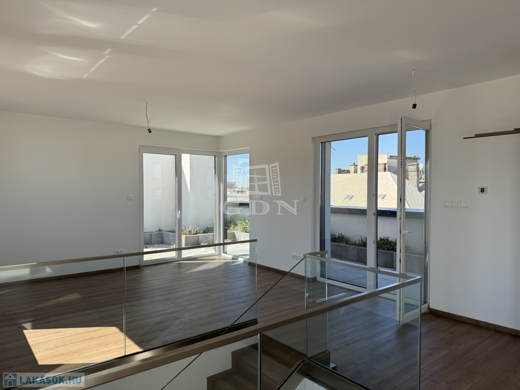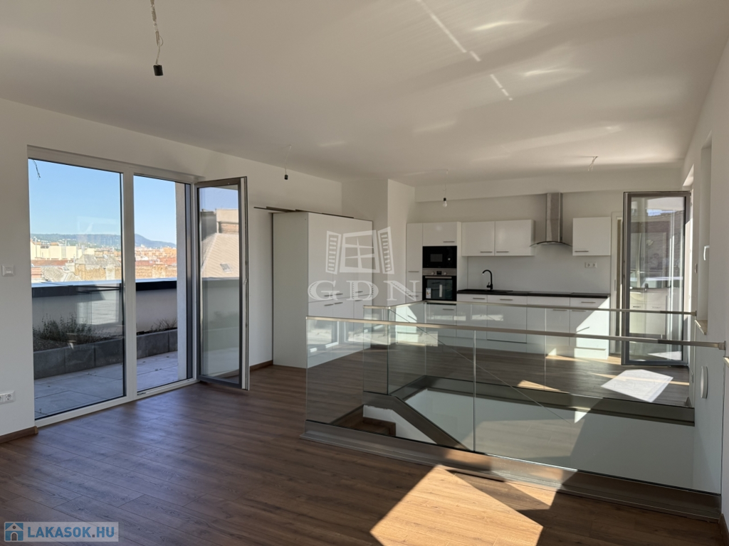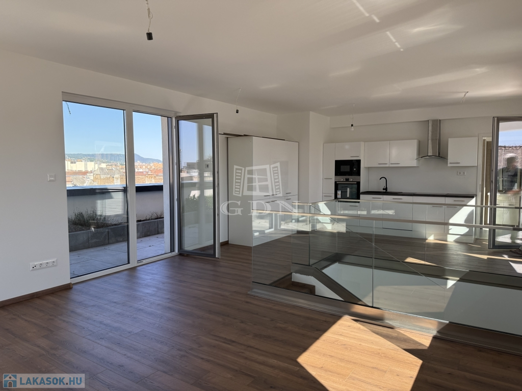 VIII. kerület csendes, mégis központi részén, új építésű ház legfelső szintjén kínálunk megvételre egy belső kétszintes, kulcsrakész, penthouse lakást, páratlan kilátással a Gellért-hegyre és a Hármashatár-hegyre, az alábbi paraméterekkel: