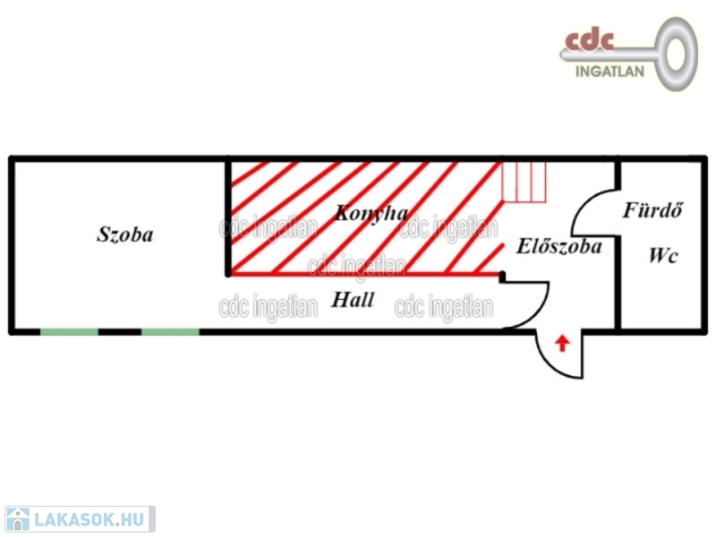 A lakás a következő helyiségekből áll: tágas, világos szoba (20 nm), fürdőszoba káddal és WC-vel (3 nm), hall (7 nm), közlekedő (10 nm) és felette a galérián a konyha (10 nm). A szoba ablakai a ház tágas, világos és csendes belső udvarára nyílnak. A lakás belmagassága 4 méteres, ezért kerülhetett kialakításra a konyha a közlekedő feletti részen. A nagy belmagasság miatt további lehetőség nyílik a szobában állógaléria építésére is.