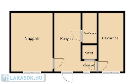 A lakás a harmadik emeleten egy körfolyosóról nyílik. A tágas konyhába érkezünk amiben egy étkező sarok is elfér. Balra a tágas nappali szoba aminek ablaka a nyitott körfolyosóra néz ez által kellően világos. A gépesített étkezősarkos konyhából nyílik a kádas fürdőszoba amiben a toalett is helyet kapott. Jobbra a közlekedőből nyílik egy kamra ami biztosítja a tárolási lehetőséget. Szemben a hálószoba aminek az ablaka szintén a folyosóra néz.