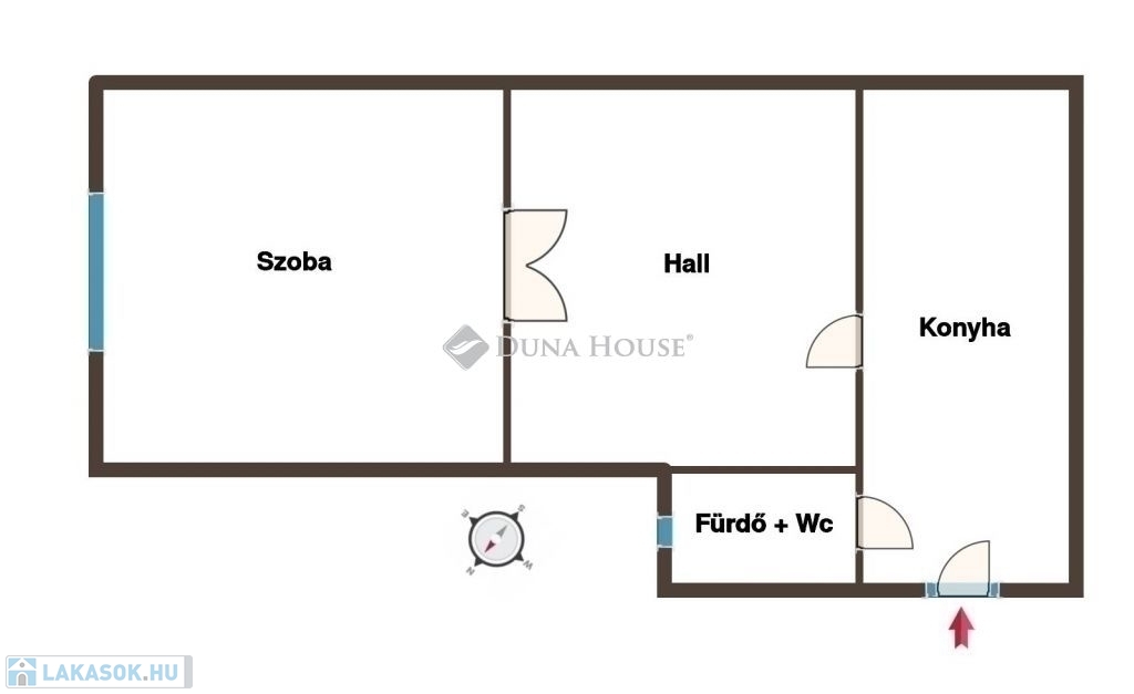 Az ingatlanban egy tágas szoba, egy szobaként, nappaliként is hasznosítható hall, egy tágas konyha, továbbá egy ablakkal is szellőztethető fürdőszoba+wc helyiségek találhatóak. Elrendezése okán fiatalok, párok, idősek, esetleg kisebb család számára ideális választás.