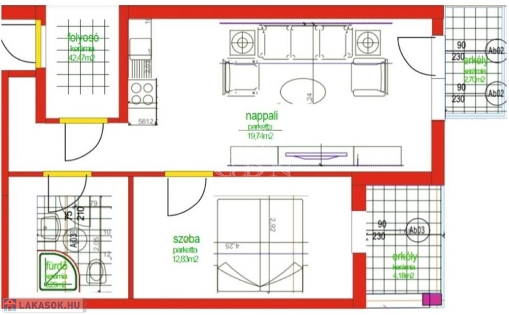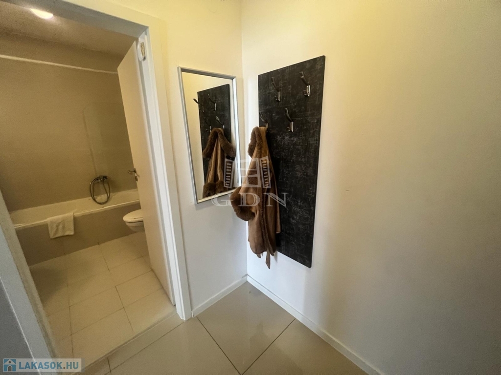Közvetlen mellette egy szintén tágas, napfényes amerikai-konyha-nappalis, 1 hálószobás összkomfortos 37 m2-es lakás is eladó 64,9 M Ft-t.