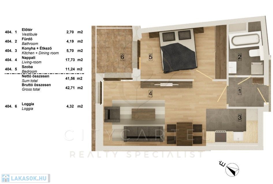 A liftes társasház 4. emeletén található, 42,71 nm-es, (41,36 nm lakás 4,32 nm loggiával) 2 szobás lakás korszerű hőszivattyús fűtés–hűtéssel és teljes körű okosotthon-rendszerrel felszerelve várja új tulajdonosát. A burkolatok még választhatók, így a leendő tulajdonos saját ízlésére szabhatja az ingatlant.