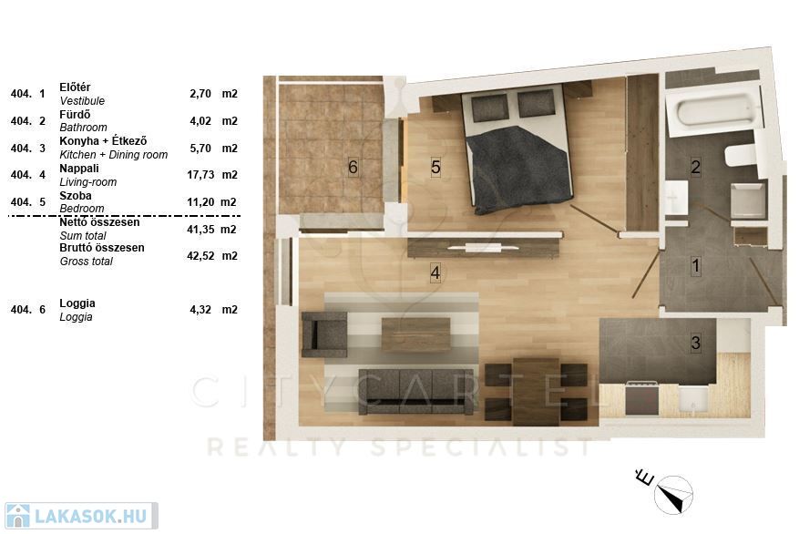 A liftes társasház 4. emeletén található, 43,55 nm-es, (41,36 nm lakás 4,37 nm loggiával) 2 szobás lakás korszerű hőszivattyús fűtés–hűtéssel és teljes körű okosotthon-rendszerrel felszerelve várja új tulajdonosát. A burkolatok még választhatók, így a leendő tulajdonos saját ízlésére szabhatja az ingatlant.
