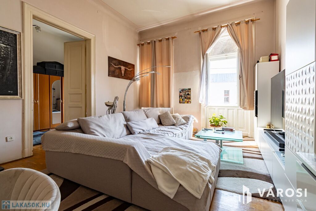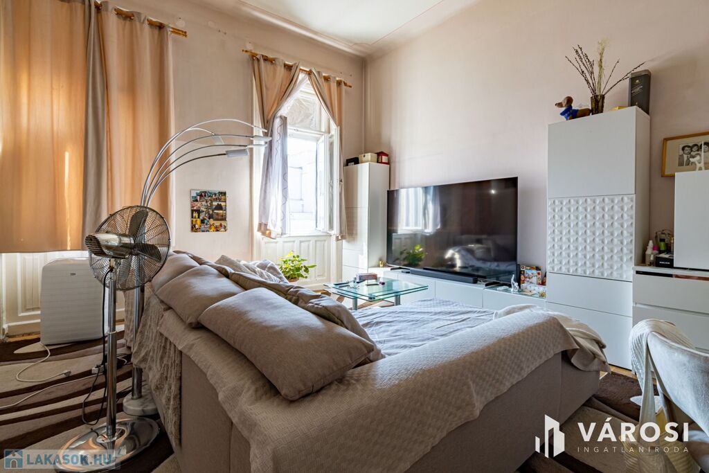 For sale in Budapest’s 8th district, on II. János Pál pápa Square,a bright, second-floor, two-room apartment, which can beconverted into a three-room layout if desired.