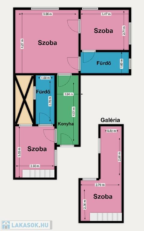 A lakás jelenlegi elosztása rendkívül praktikus: három külön nyíló hálószoba, két fürdőszoba, utcai és udvari nézetű ablakokkal. A 405 cm-es belmagasság lehetővé tette egy galéria kialakítását, ami tovább növeli a hasznos teret.