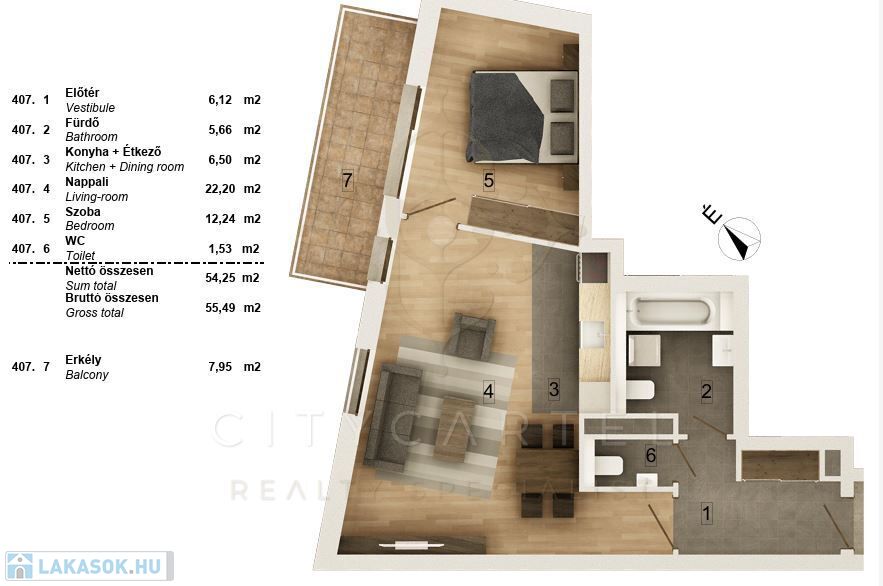 A liftes társasház 4. emeletén található, 58,23 nm-es, (54,25 nm lakás 7,95 nm terasszal) 2 szobás lakás korszerű hőszivattyús fűtés–hűtéssel és teljes körű okosotthon-rendszerrel felszerelve várja új tulajdonosát. A burkolatok még választhatók, így a leendő tulajdonos saját ízlésére szabhatja az ingatlant.
