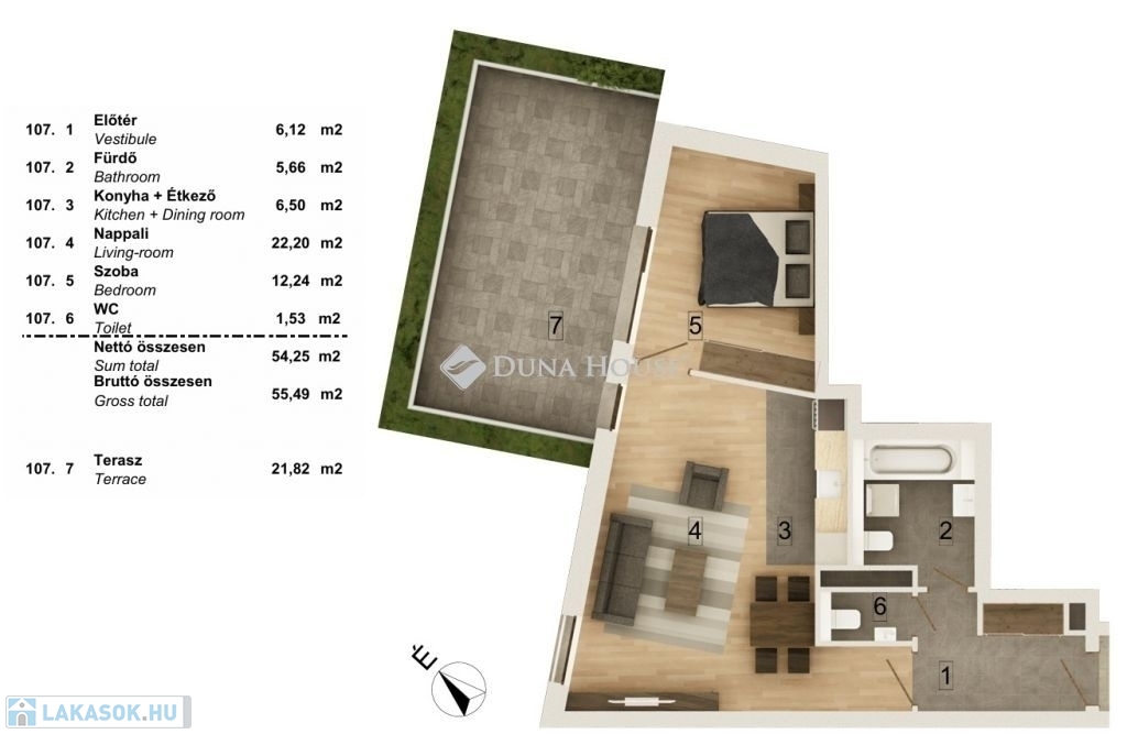 Kiváló elrendezésű lakás 54,25 m2 hasznos lakóterülettel és 21,82 m2-es terasszal.