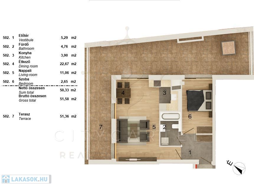 A liftes társasház 5. emeletén található, 60,57 nm-es, (50,3 nm lakás 51,36 nm terasszal) 2 szobás lakás korszerű hőszivattyús fűtés–hűtéssel és teljes körű okosotthon-rendszerrel felszerelve várja új tulajdonosát. A burkolatok még választhatók, így a leendő tulajdonos saját ízlésére szabhatja az ingatlant.