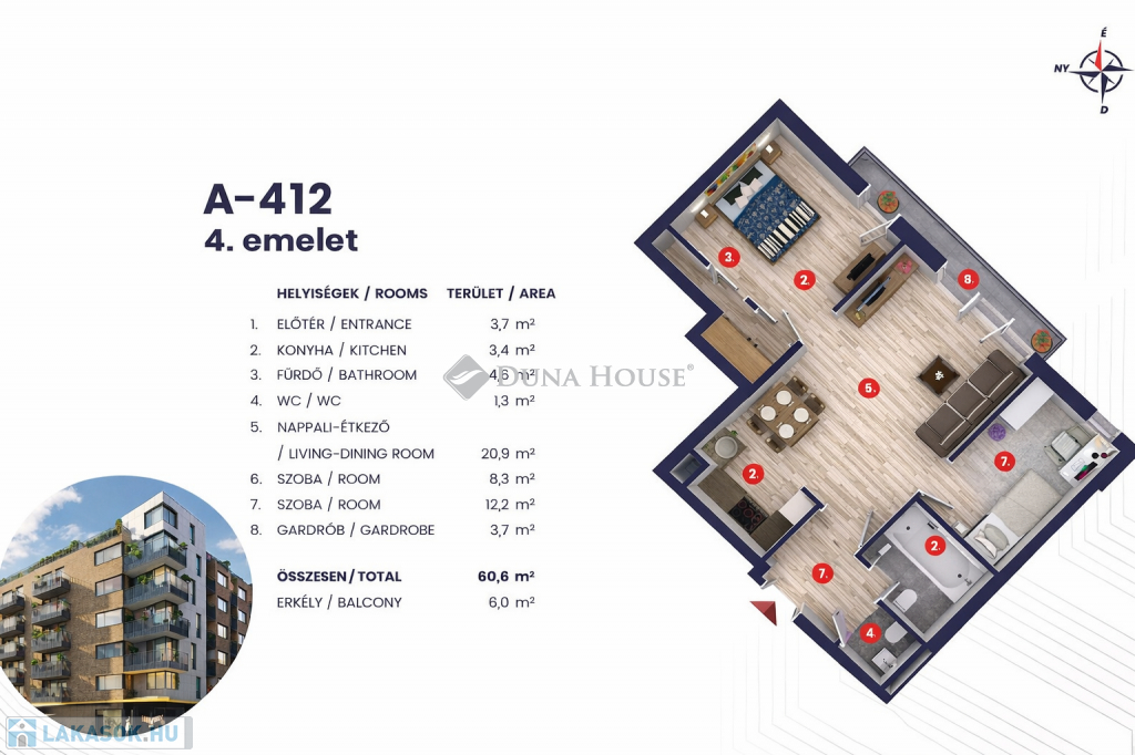 ÚJ ÉPÍTÉSŰ, VILÁGOS LAKÁS VÁRJA ELSŐ LAKÓJÁT ERKÉLLYEL ÉS TEREMGARÁZZSAL!Eladó egy 2024-ben épült, modern társasház 4. emeletén található, 58 m²-es, világos, kiváló elosztású lakás 6 m²-es erkéllyel. A lakás eddig nem volt lakva, így Ön lehet az első beköltöző!A tágas nappali nagy ablakfelületekkel rendelkezik, a két külön nyíló hálószoba pedig csendes és jól szeparált. A lakás friss, modern, igényes kivitelezésű tökéletes választás otthonnak vagy befektetésnek.Főbb jellemzők:- 58 m² alapterület- Új építés (2024) első lakó- 4. emelet, liftes ház- 6 m² erkély- Világos, nagy ablakos terek- Modern kivitelezés, friss burkolatok- Teremgarázs-beálló (8 100 000 Ft)- Rendezett, új környék, kiváló közlekedéssel és folyamatosan fejlődő környezettel.Ideális pároknak, egyedülállóknak, vagy hosszú távra tervező befektetőknek.További információért vagy megtekintésért keressen bizalommal!---------------------------
