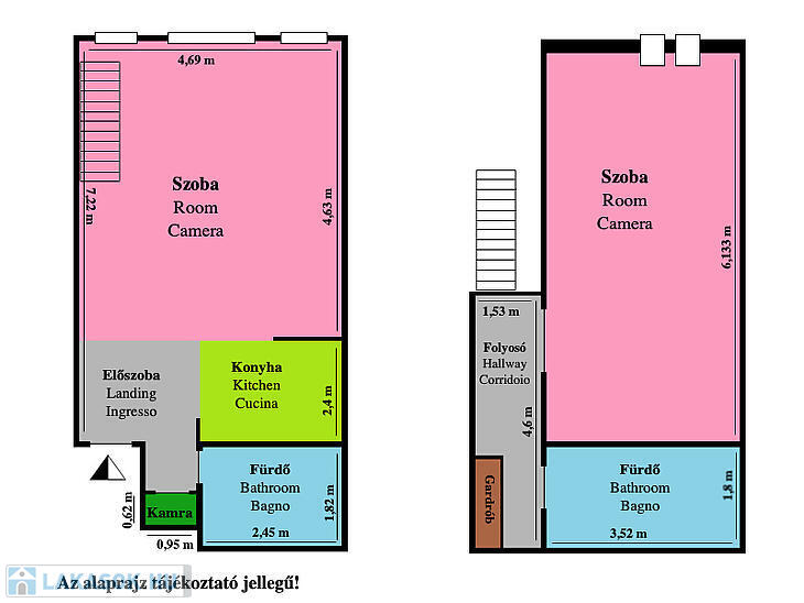 Az alsó szinten tágas, utcai nézetű, amerikai konyhás tágas nappali található délkeleti tájolással, valamint egy kamra és egy fürdőszoba. A felső szinten előtér, gardróbhelyiség, hálószoba és egy másik fürdőszoba kapott helyet.