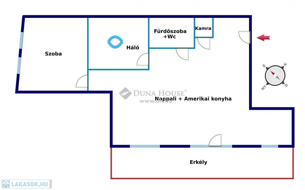 A lakás központi életterét egy 46m2-es, amerikai konyhás nappaliszoba adja. Minden további helyiség, azaz két háló, egy fürdőszoba + wc, és egy kamra helyiségek is innen megközelíthetőek, mind külön bejáratúak. A nappaliból a 16m2-es, tágas erkélyre is kiléphetünk. Itt akár egy kiülő rész, és egy elektromos grill is kényelmesen elhelyezhető.