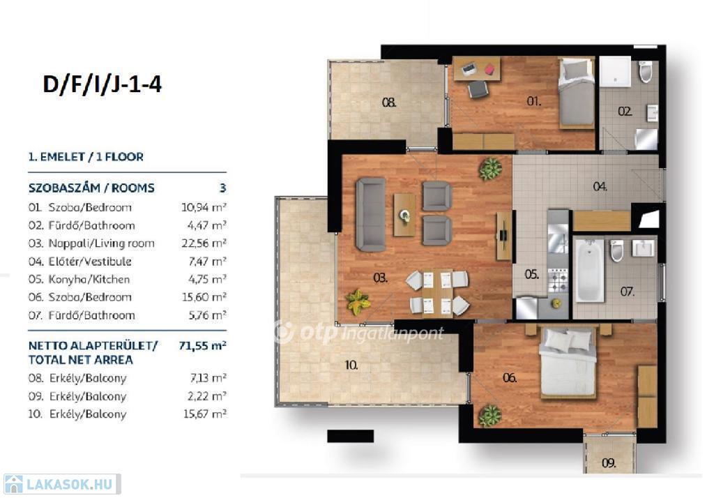Lakások mérete: 43 nm-es, 1,5 szobás lakástól a 150 nm-es, 5 szobás és a tetőteraszos, exkluzív penthouseig.