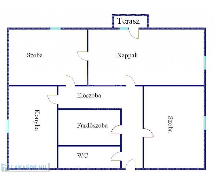 előszoba, konyha+étkező, WC, fürdőszoba+WC, nappali, 2 szoba, erkély(3m2).