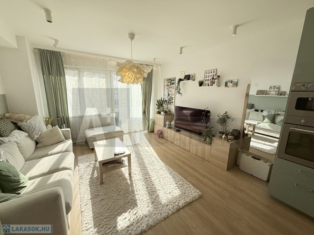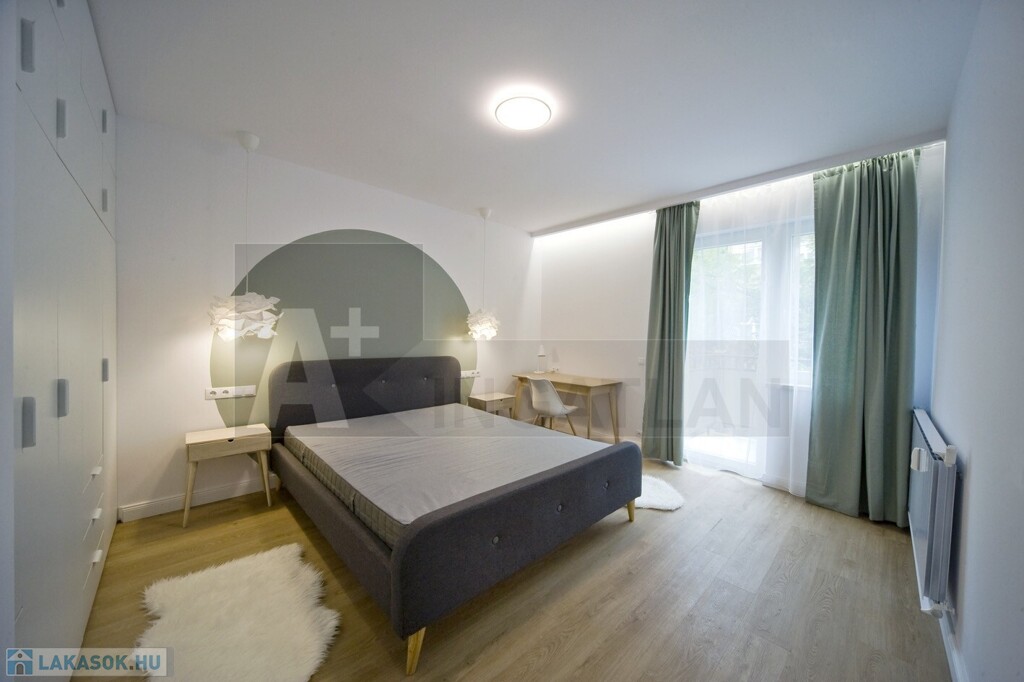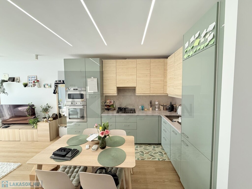 Elrendezését tekintve: a lakás központi része , az amerikai konyhás nappali , magasfényű konyhabútorral , kiváló háztartási gépekkel és a két hálószoba , két fürdőszobával és a napfényes 7m2-es , erkély , mely abszolút ideális a reggeli kv vagy akár az esti vacsora helyszínéül...