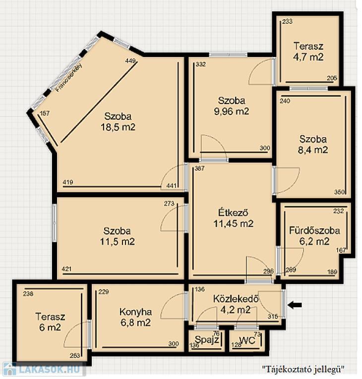 A lakásnak két terasza is van (6 nm, 5 nm). Az egyik terasz az utcai oldalra néz, míg a másik az oldalsó kertre.