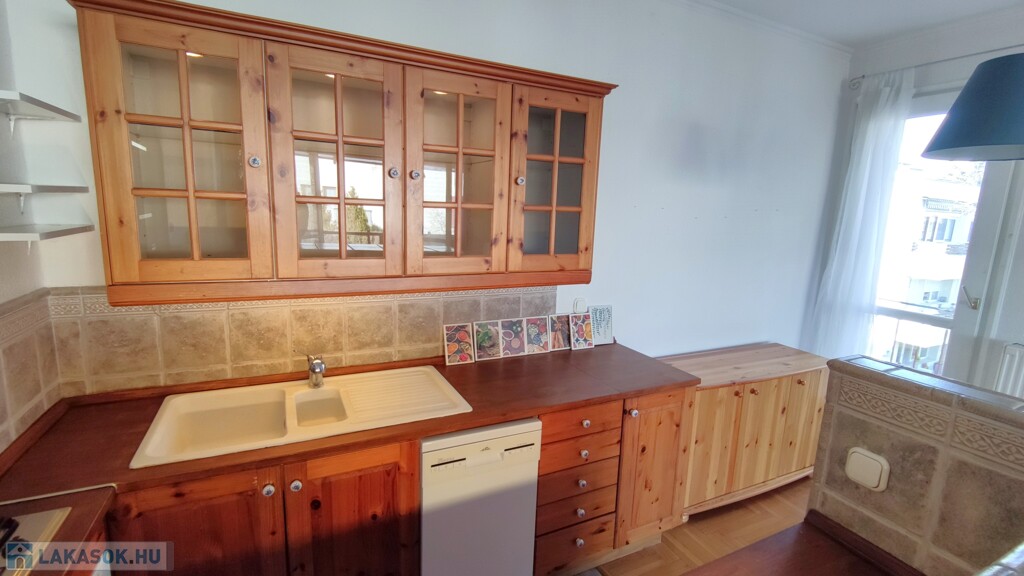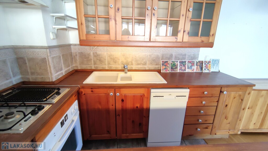 A konyha beépített szekrényekkel, gáztűzhellyel, sütővel, elszívóval, mosogatógéppel, beépített hűtővel, fagyasztóval felszerelt.