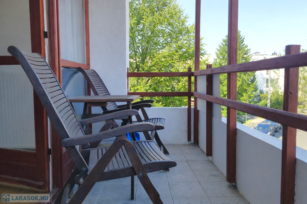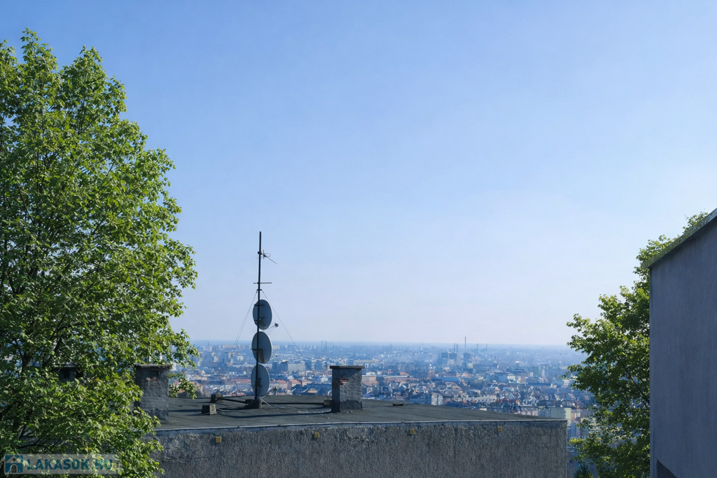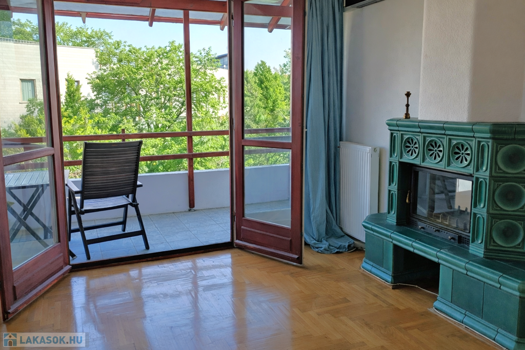 The TOP floor, BRIGHT apartment has a beautiful view of the QUIET, green environment. The living room with American kitchen is east facing, and through the glass patio door that fills the entire wall, we can exit to the 7 sqm balcony, from which a partial panorama opens.