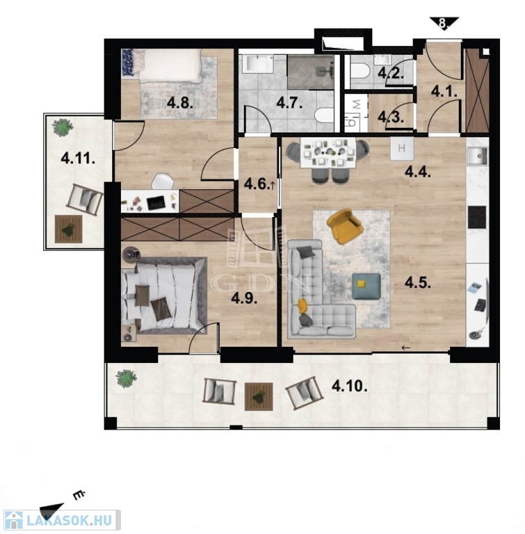 49, 54, 71, 80 nm2 méretű ingatlanok közül lehet választani. Földszinti lakások saját terasszal és kertrésszel míg az 1. és 2. emeleti lakások nagy teraszokkal rendelkeznek.
