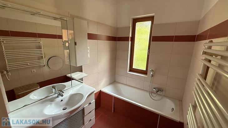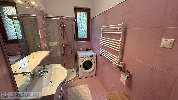 Ezen kívül van még egy 4,5 nm-es fürdőszoba, illetve egy konyha, amely jelenleg egy légtérnek érződik a nappalival, de igény szerint ezt tovább lehet szeparálni. A konyha beépített, gépesített: főzőlappal, sütővel, kivezetett páraelszívóval és mosogatógéppel van ellátva.