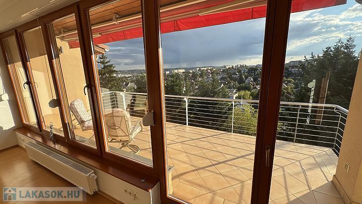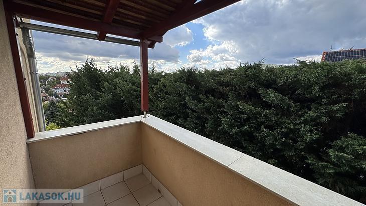 A nappaliból nyílik egy 15 nm-es délnyugati fekvésű, gyönyörű panorámával rendelkező, félig fedett, motoros árnyékolóval ellátott terasz, illetve szintúgy a nappaliból közelíthetjük meg az oldalsó, nyugati fekvésű 5 nm-es, teljesen fedett erkélyt.