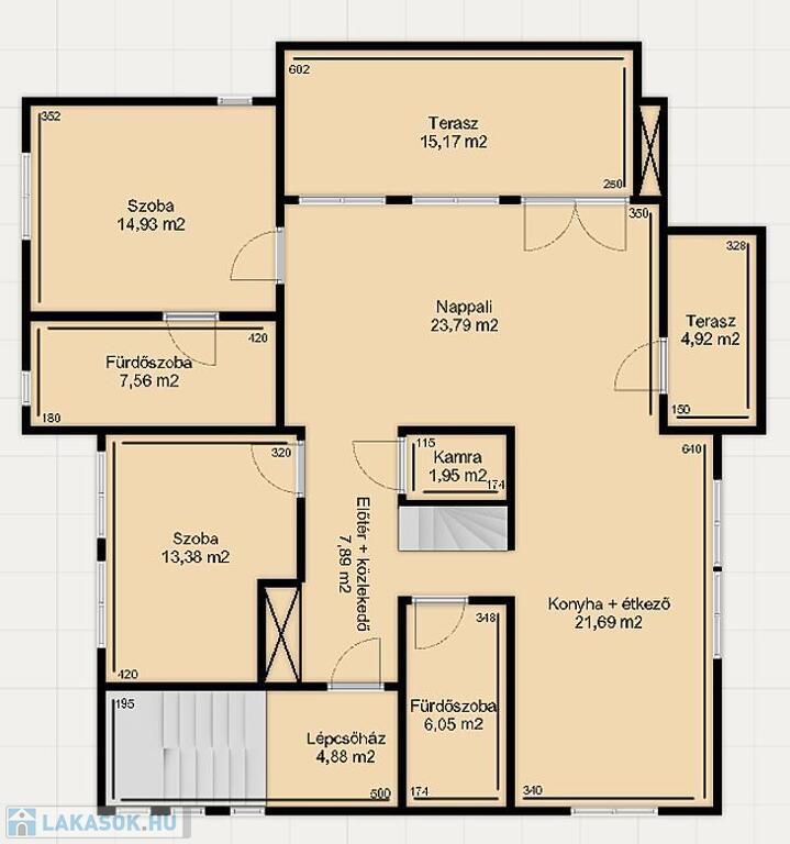 A 24 nm-es nappalin kívül a lakásban 3 hasonló méretű (14 nm) hálószoba található, illetve igény szerint a felső alaprajznál feltüntetett dolgozószobát át lehet alakítani egy teljes értékű 19 nm-es hálószobává. A nappalit, az előteret és a konyha/ étkezőt, középen a szinteket összekötő lépcső osztja meg, melynek aljába egy 2 nm-es kamra is kialakításra került. Az ingatlanban két fürdőszoba található.
