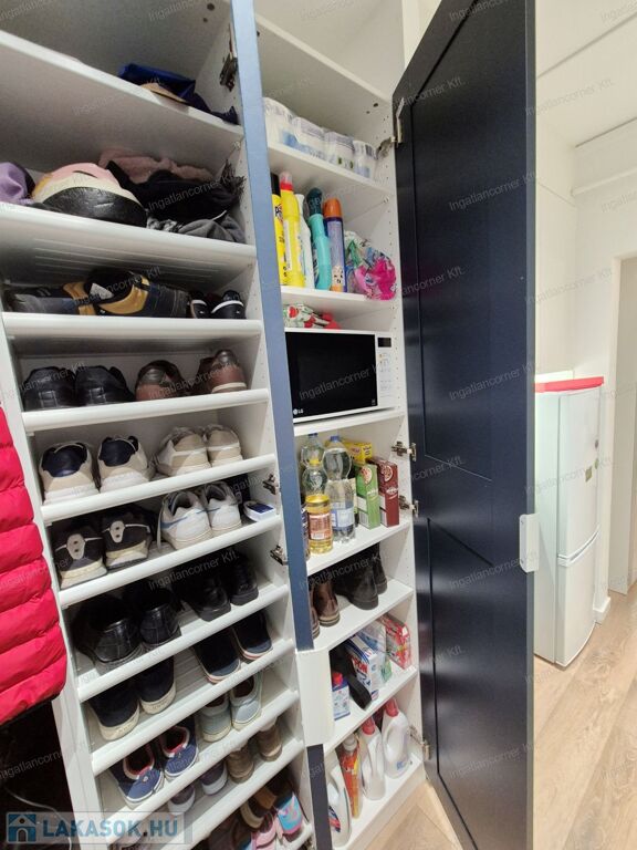•Számtalan beépített tároló: előszobabútor cipőtárolóval és kabáttartóval, kamraszekrény, hálószobai tükrös gardróbszekrény