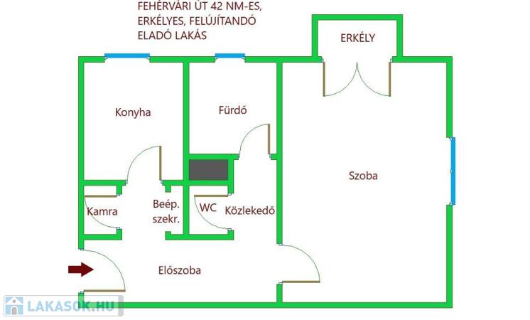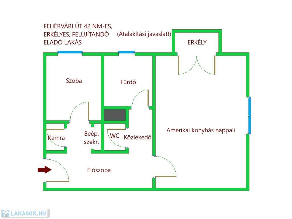 A lakás praktikus elrendezésű, minden négyzetmétere jól kihasználható, ugyanakkor a felújítás során kiválóan alakítható: könnyedén kialakítható amerikai konyhás nappali + külön hálószoba, így modern, élhető otthon hozható létre.