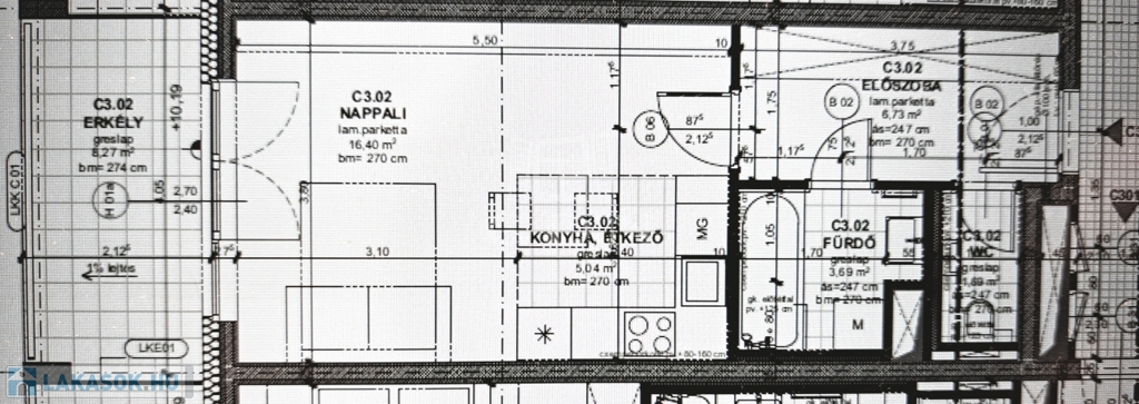 A hirdetésben szereplő lakás 33,55 m²-es, 1 szobás,3. emeleti, és tartozik hozzá egy 8,27 m²-es erkély is.
