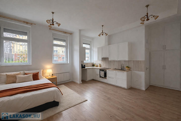 Az ingatlan utcai nézetű, nagy ablakainak köszönhetően rendkívül világos, barátságos hangulatú. A praktikus elrendezés és a letisztult, modern kialakítás kényelmes életteret biztosít, míg az egy légtérben kialakított nappali–konyha megoldás tágas érzetet kelt.