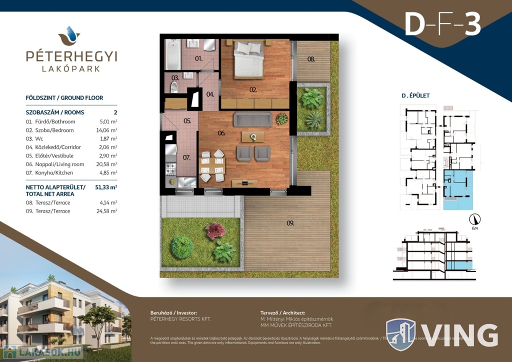 A hirdetésben szereplő lakás a D épület földszintjén található, amerikai konyhás nappali +1 hálószobás elrendezésű. Alapterülete 51,33 m2 + 31 m2 terasz.