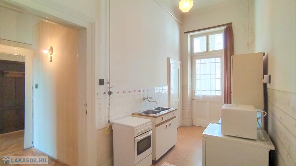 -konyha (11 m2), nyugati fekvésű, belső udvarra néző, a konyhába bejárati ajtó nyílik a függőfolyosóról, így akár 2 kisebb lakássá is alakítható