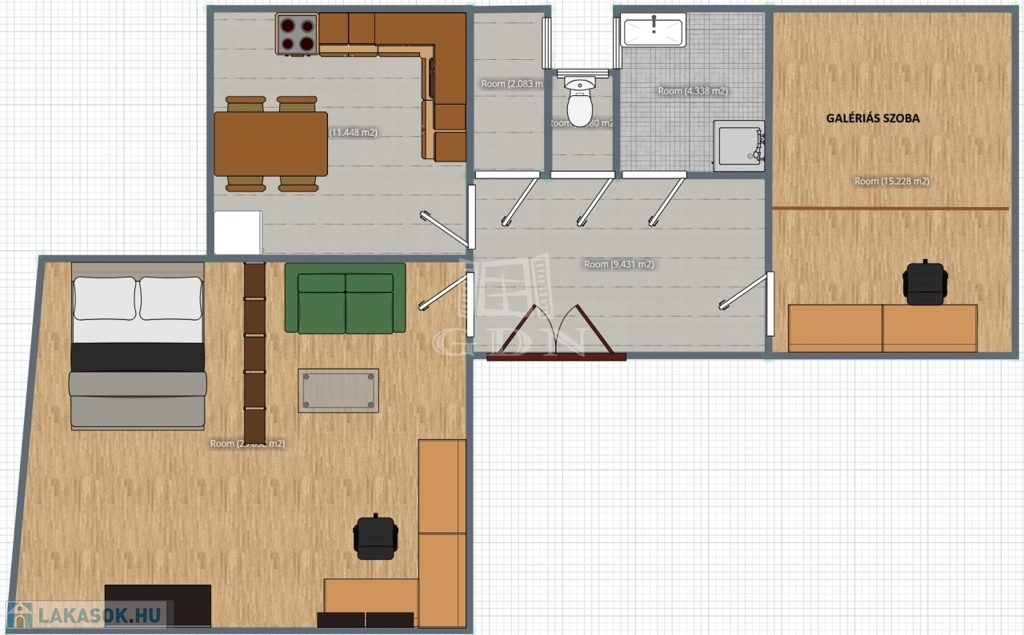 A lakás teljes bútorzattal és gépesítéssel (pl. kanapé, ágy, PAX szekrény, hűtő, mosógép) is megvásárolható. A 3,80 m belmagasság, a galéria (8 m²) és az átgondolt elosztás tágas, praktikus életteret ad.