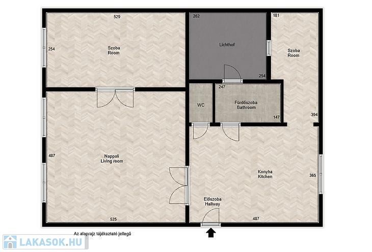 A lakásban egy tágas nappali és két hálószoba került kialakításra. A központi térben kapott helyet az ablakos, ideális méretű, modern étkezős konyha.