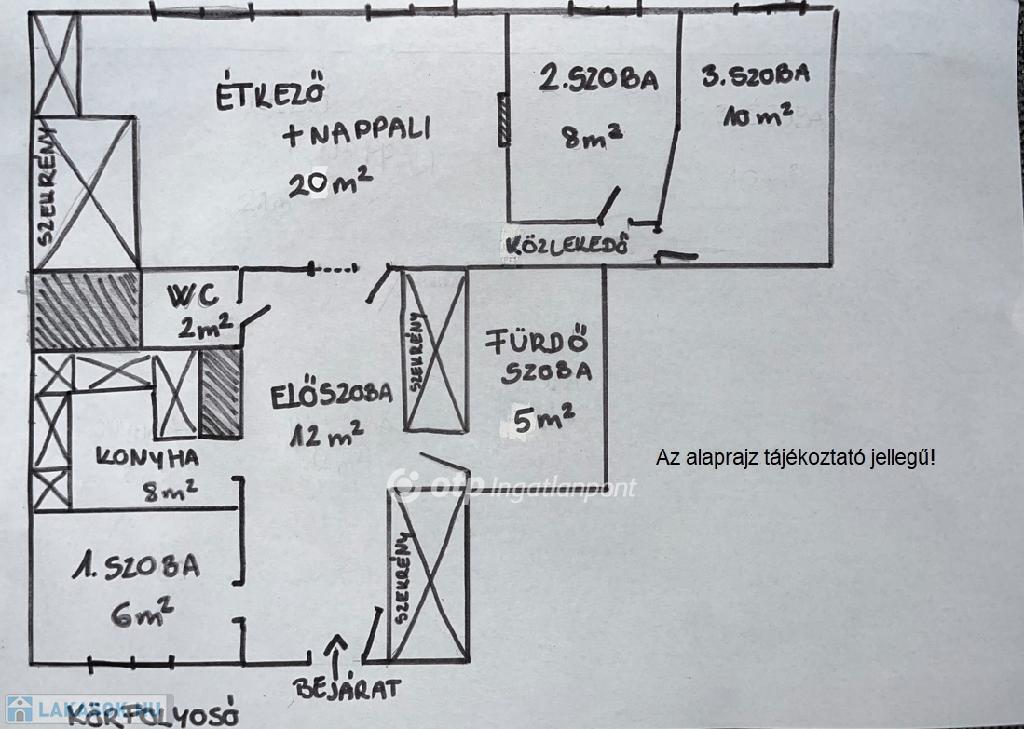 A tulajdoni lap szerinti, eredetileg kétszobás lakás jelenleg egy szoba és három félszoba elrendezésü. Korszerű, nagyméretű, műanyag nyílászáro/ók jó benapozást biztosítanak. Nagy belmagasságú terek. A lakás teher és igénymentes.