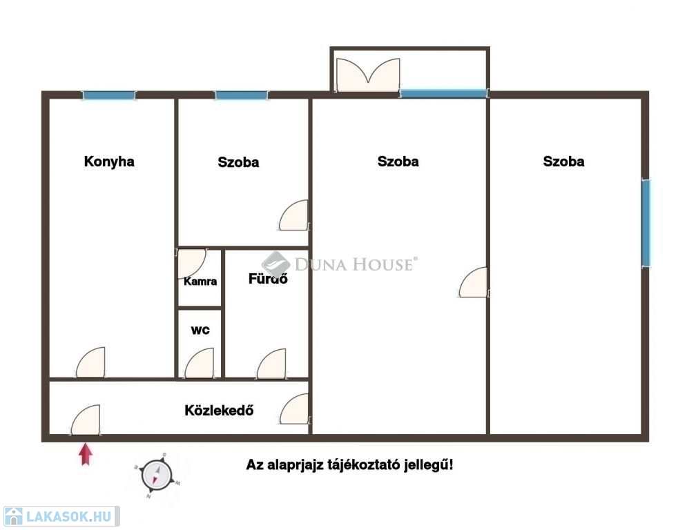 Elrendezés: nappali + 2 szoba, konyha, fürdő, WC, erkély, előszoba