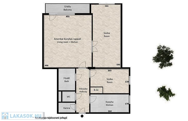 Az előszobából közelíthetjük meg az ablakos, étkezős konyhát, a zuhanyzós fürdőszobát, a külön WC-t valamint a kamrát.