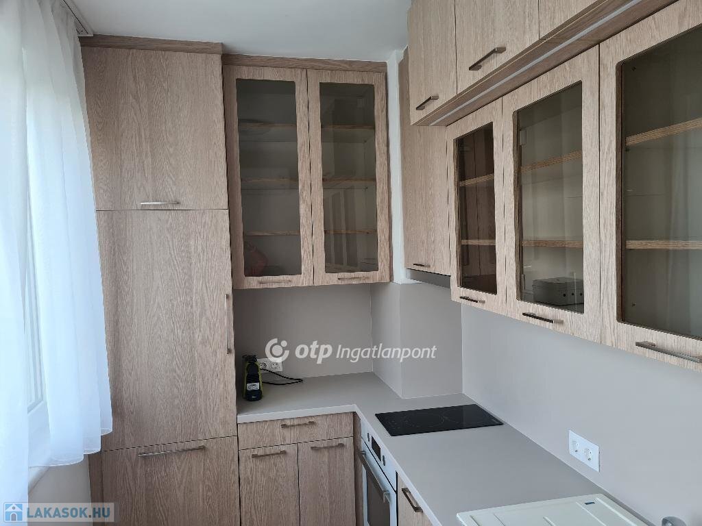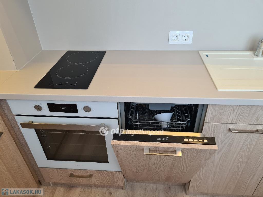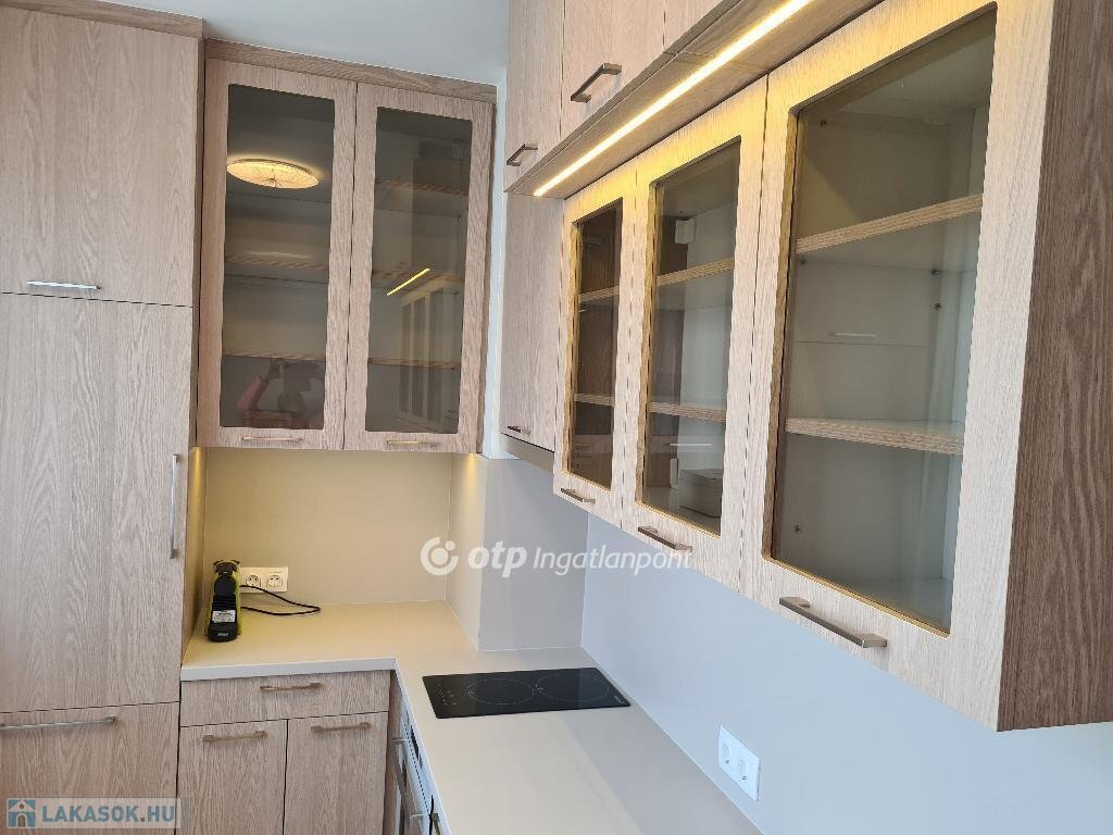 Konyha: beépített bútor, kerámia főzőlap, sütő, hűtő, mosogatógép, kapszulás kávéfőző