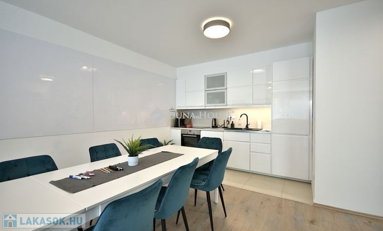 Budapest, 12. kerület Városmajor utcában, 2018-ban épült társasház első emeletén, tágas belső kertre néző, napfényes, nappali + hálós, amerikai konyhás, távolról vezérelhető mennyezeti hűtő-fűtő rendszerrel ellátott lakás, teremgarázs beállóval és tárolóval. A fűtés hőjét geotermikus hőszivattyús rendszer biztosítja. Az ingatlan gépesített, hűtőszekrény fagyasztóval, mosogatógép, mosógép, elszívó, főzőlap, sütő és mosógép, riasztó és az elektromos redőnyök is a felszereltség részei. A közös költség vízzel, fűtés és hűtés előleggel együtt 46.000 Ft, azaz ezen felül villanyt, és igény szerint internet és TV előfizetést kell fizetni.A teremgarázs beálló 17 MFt-ért, és mögötte a saját tároló 3 MFt-ért eladó.