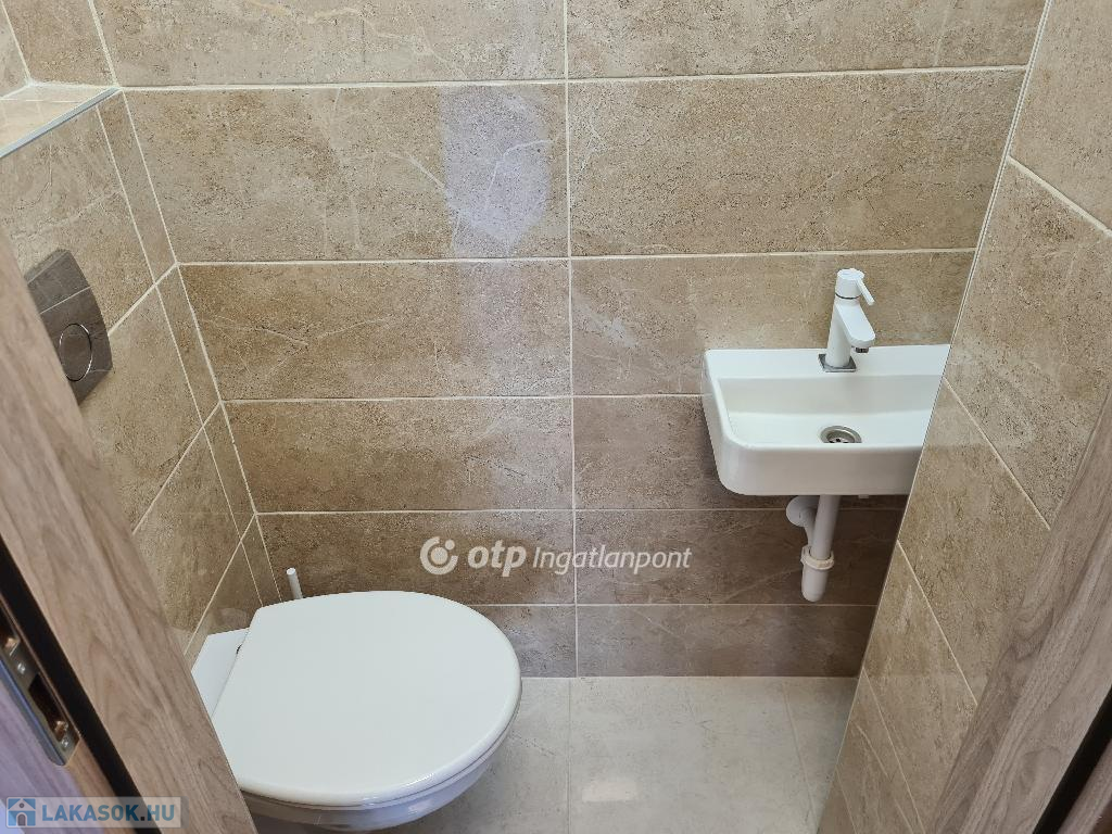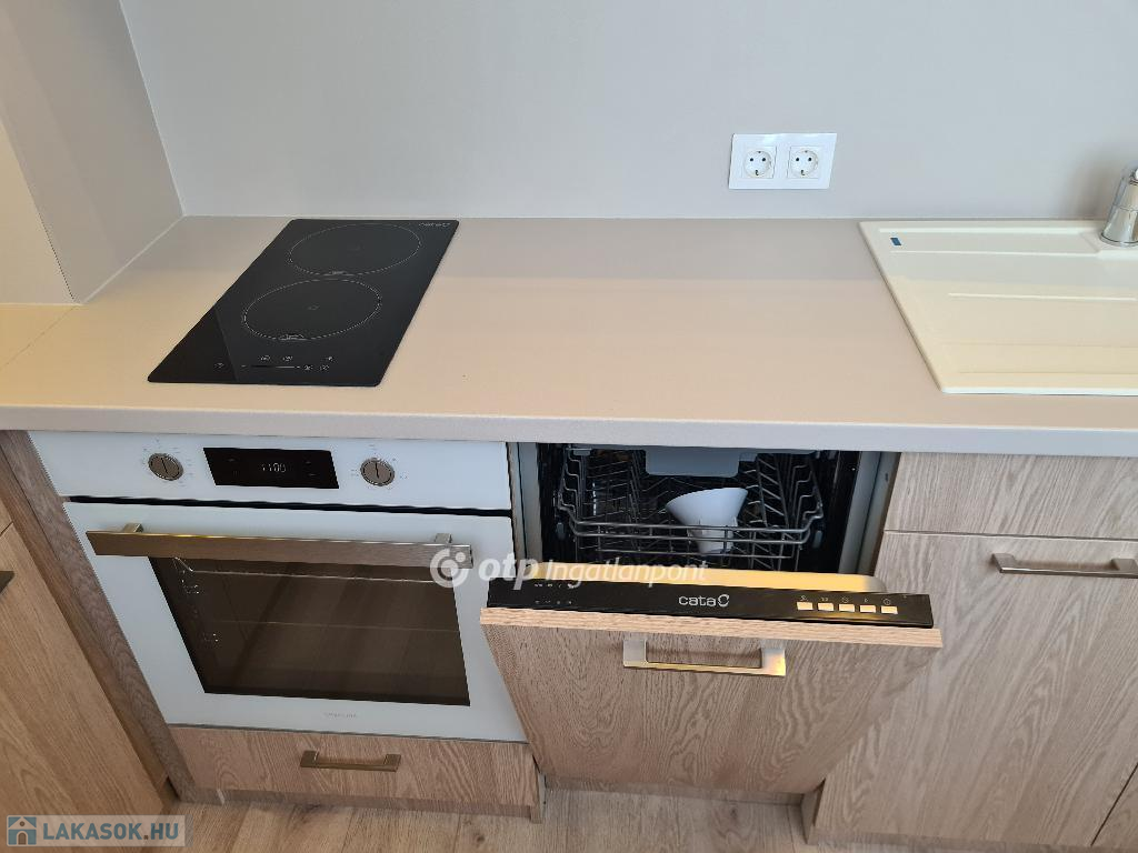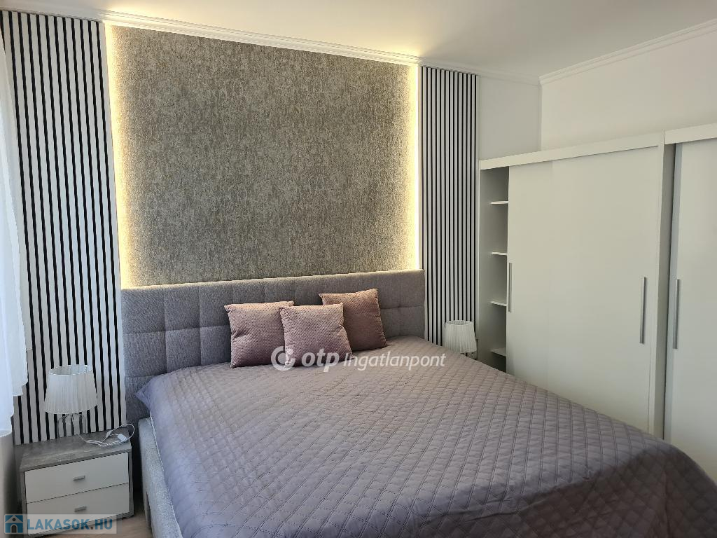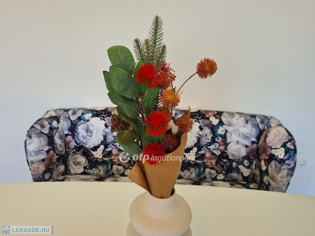 A tulajdonos a loggiát beépítette, növelve ezzel a nappali-étkező nagyságát, ugyanakkor végig, földtől plafonig érő fix ablakokkal és dupla-szárnyú erkélyajtóval nyitotta meg a teret a panoráma és a zárt, parkosított, játszóteres udvar felé. A nappaliban ágyazható, ágyneműtartós ülőgarnitúra, étkezőasztal székekkel, szófával, beépített, pakolható szekrénnyel és szekrénysorral. A félszobában mindössze egy íróasztal és egy gardrób szekrény található, nyitva hagyva a lehetőséget, hogy dolgozószobaként vagy gyerekszobaként fog funkcionálni. A hálószobában ágyneműtartós franciaágy éjjeliszekrényekkel, az egyik falon gardrób szekrény, a másikon komód szolgálja a leendő bérlő kényelmét. A fürdőszoba fürdőkádas, mosó-szárítógéppel felszerelt. A konyha beépített, jól pakolható szekrénnyel, 2 főzőlapos kerámia tűzhellyel, beépített hűtővel, sütővel, mosogatógéppel, kapszulás kávéfőzővel felszerelt. Az előszobában szintén beépített szekrény került kialakításra, a kabátoknak, cipőknek.