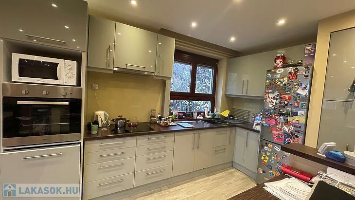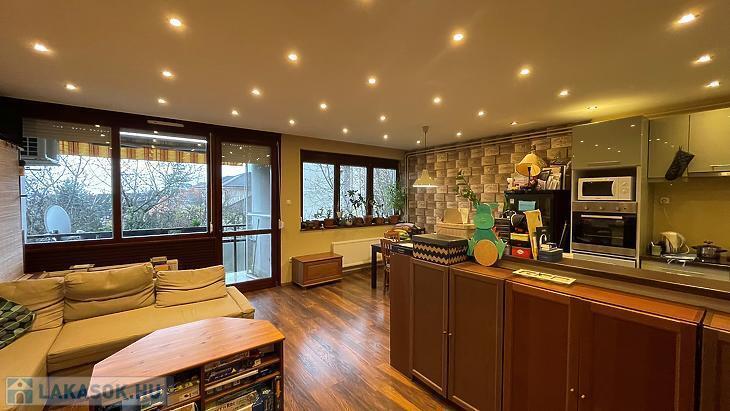A lakás központi része a tágas, nagy üvegfelülettel rendelkező, dk-i fekvésű, erkélykapcsolatos, szép kilátással rendelkező amerikai konyhás nappali.