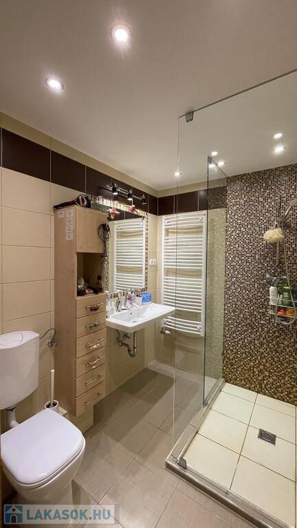 Szomszédságukban találjuk az épített zuhannyal és wc-vel szerelt fürdőszobát és a háztartási helységet, amelyből igény szerint még egy további fürdőszoba is kialakítható.
