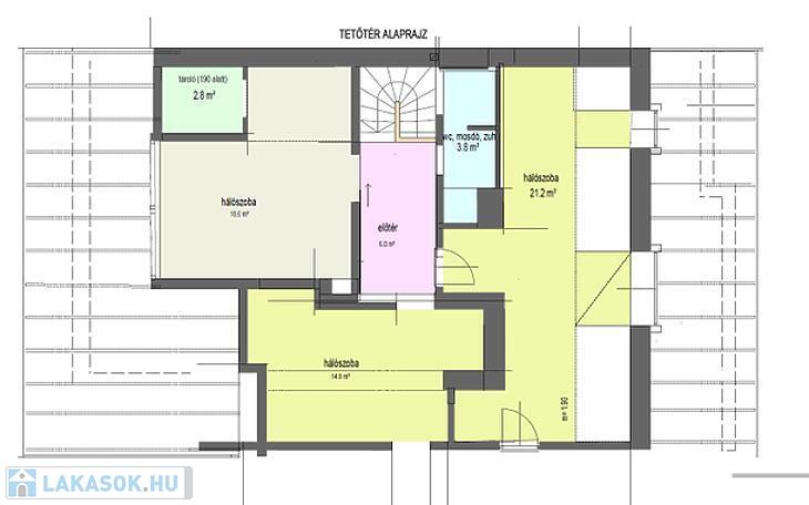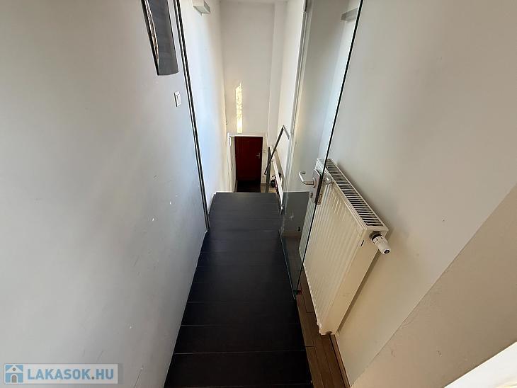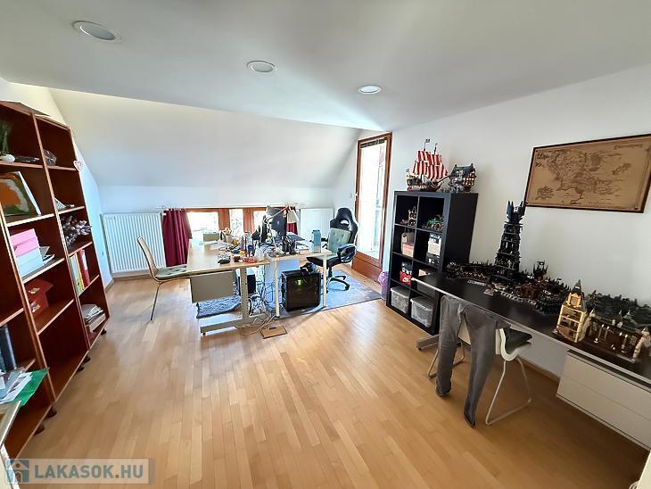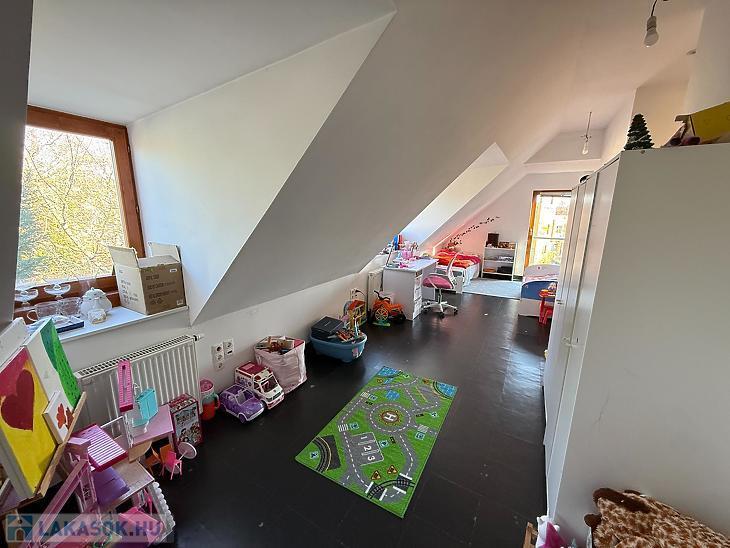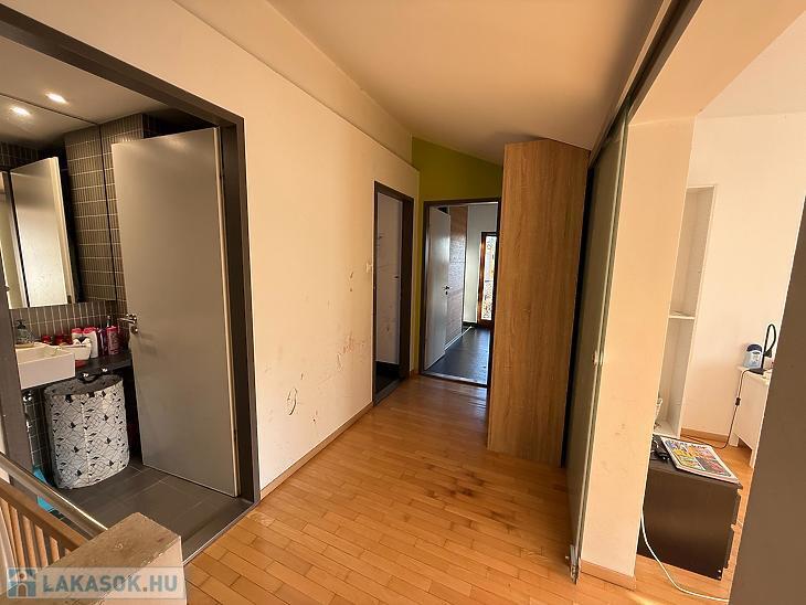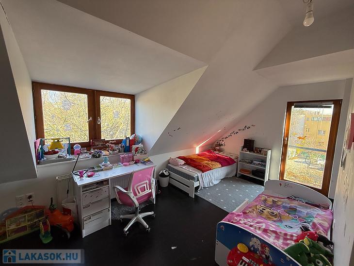 A szigetelt ház 2 lakásos, 3 szintes, amelyből az eladásra kínált lakás a felső két szinten helyezkedik el. A lakás 6 szobával rendelkezik, amelyből az első emeleten található egy nappali + 2 szoba, a többi szoba a második emeleten helyezkedik el.