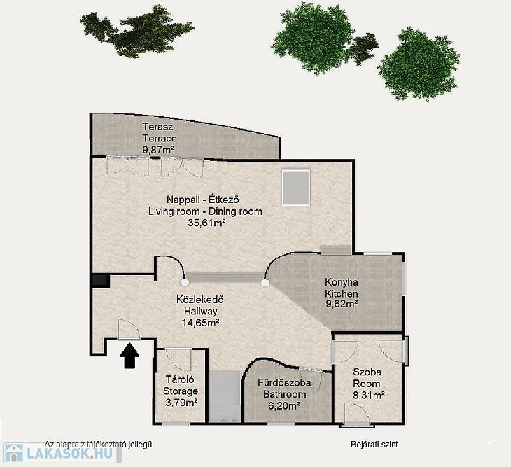 A bejárati szinten egy tágas, panorámás, kényelmes méretű terasszal rendelkező nappali, egy ugyancsak panorámás, szeparált konyha, egy franciaerkéllyel rendelkező hálószoba, egy zuhanyzós fürdőszoba, tároló és egy előszoba található.
