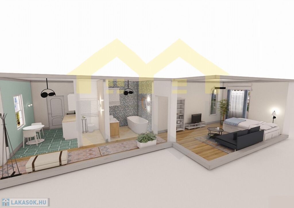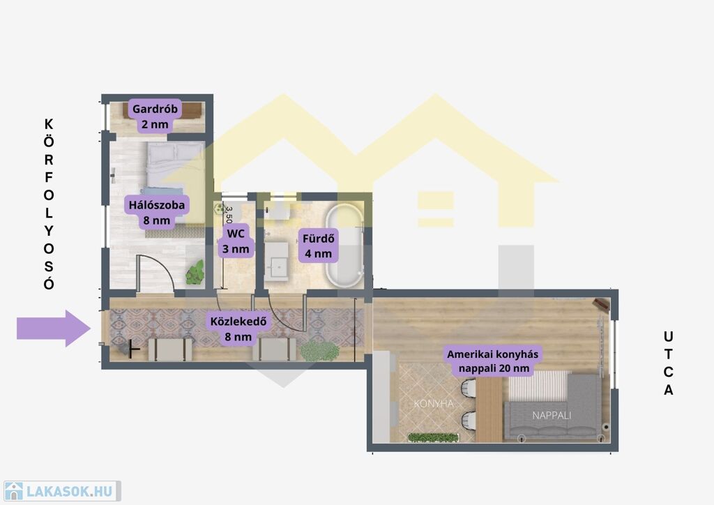 A 45 nm-es lakást a második emeleten találhatjuk, amit egy szép lépcsőházon keresztül vagy lifttel közelíthetünk meg. A bejárat a körfolyosóról nyílik az előszobába, ahol balra rögtön a konyha található, külön tárolóval. A hosszú előszobából balra nyílik még a fürdőszoba, és külön toalett. A közlekedő végén a 20 nm nappali tárul elénk. Ablakai az egyirányú utcára néznek.
