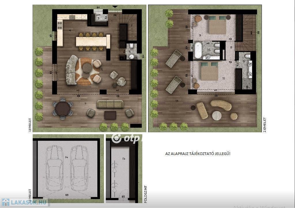 A 167 m2-es, 3 lakás belső kétszintes, kívülről közvetlenül és a kétállásos garázs felől is megközelíthető. Az előtérből a tágas nappali-étkező-konyha részbe lépünk. A nappali teljes frontján, illetve az étkező felőli oldalán is megközelíthető a 48 m2-es tágas terasz. A felső szinten további 2 hálószoba található, mindegyiknek saját fürdője van és mindkét hálóból megközelíthető a 63,8 m2-es terasz.