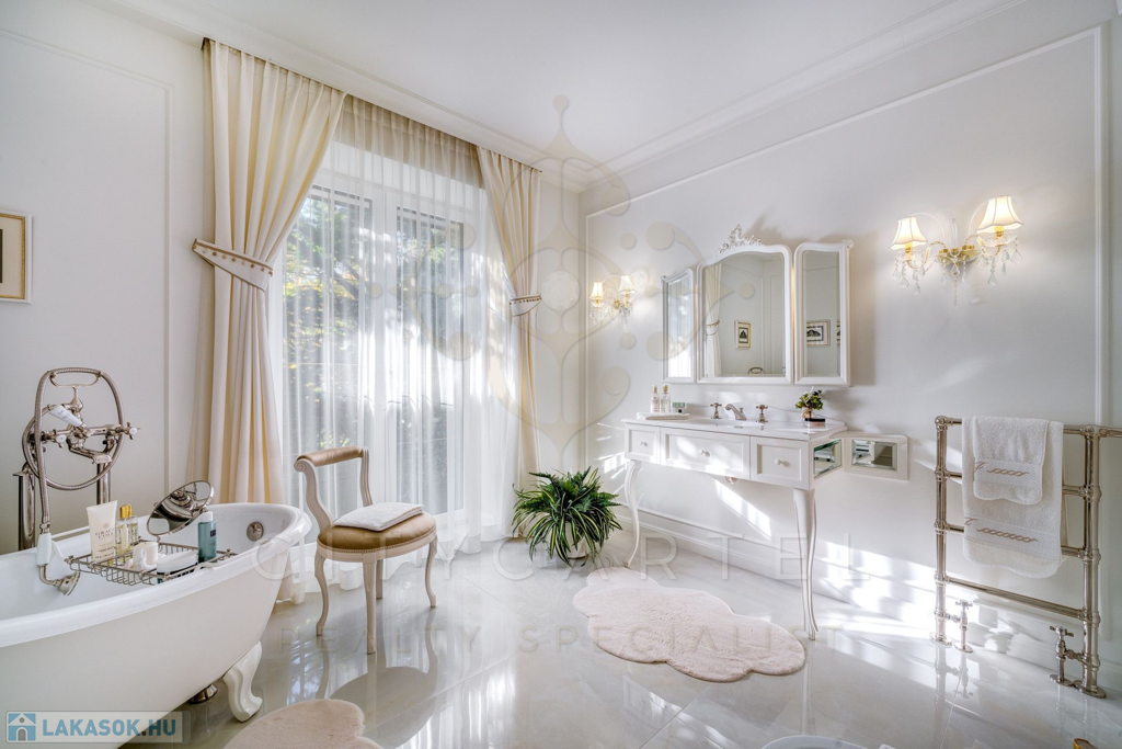 A helyiségek berendezése minden luxusigényt kielégít, ahol az elegáns, aprólékosan kidolgozott modern-klasszikus enteriőr a kifinomult belsőépítészeti és lakberendezői munka tökéletes példája.