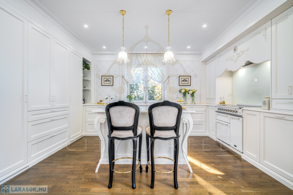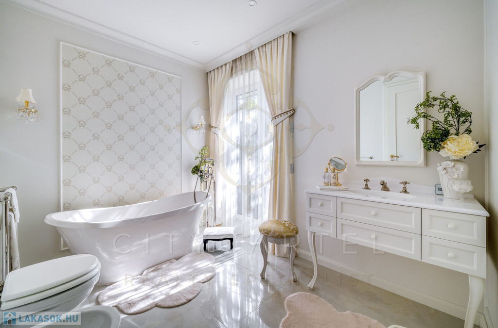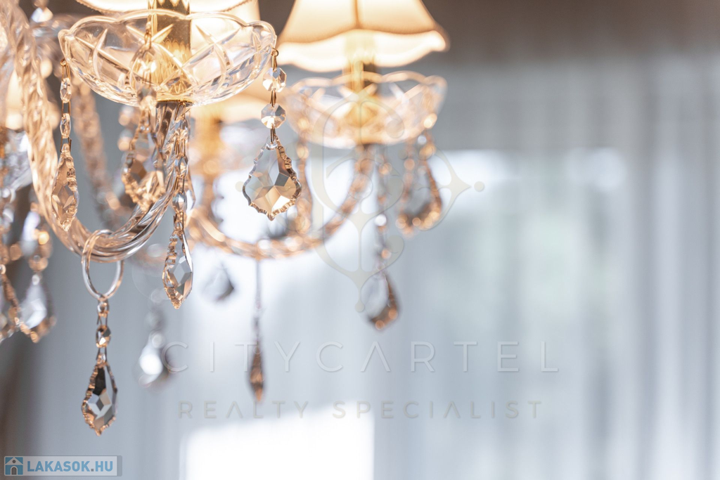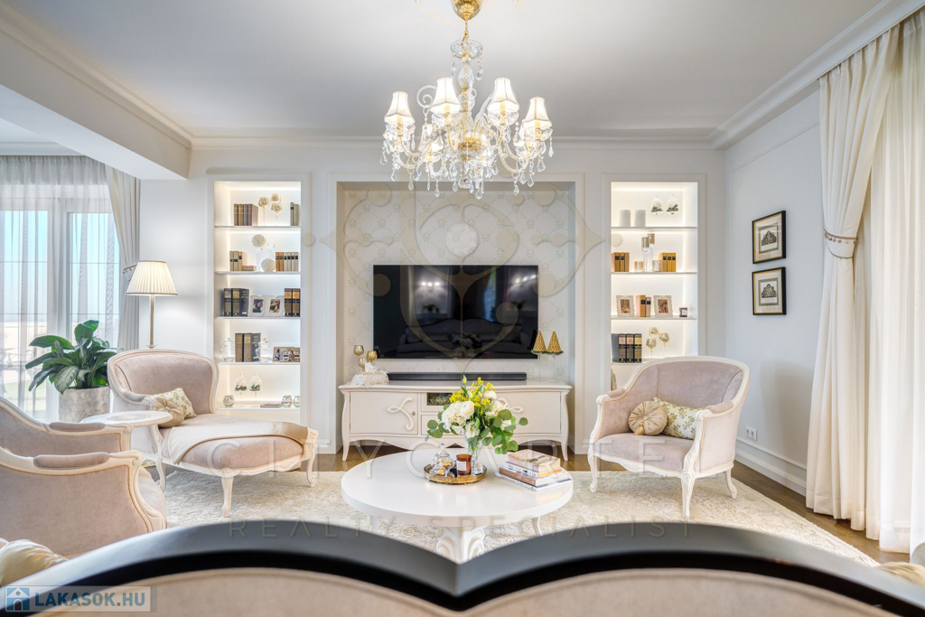 A helyiségek berendezése minden luxusigényt kielégít, ahol az elegáns, aprólékosan kidolgozott modern-klasszikus enteriőr a kifinomult belsőépítészeti és lakberendezői munka tökéletes példája.