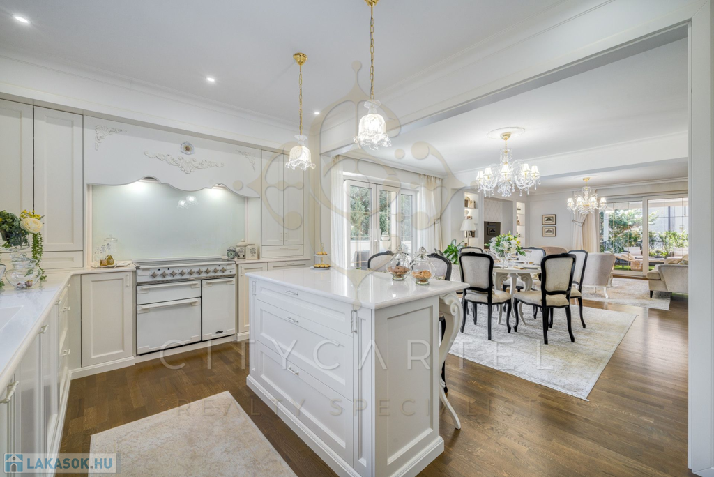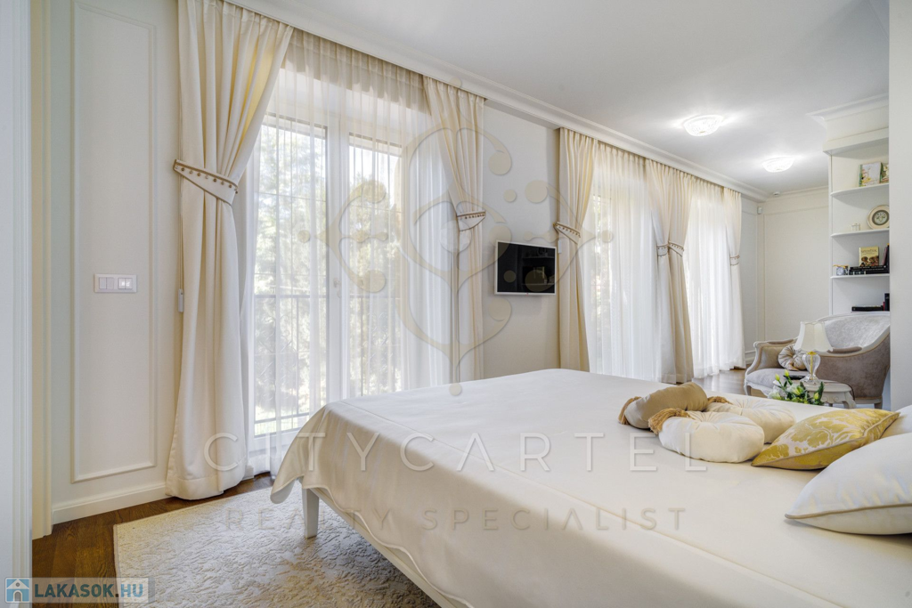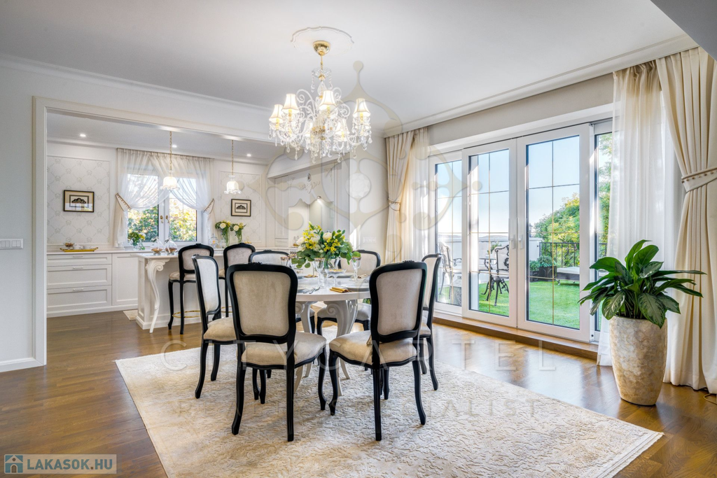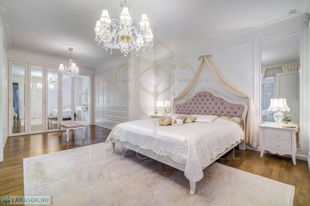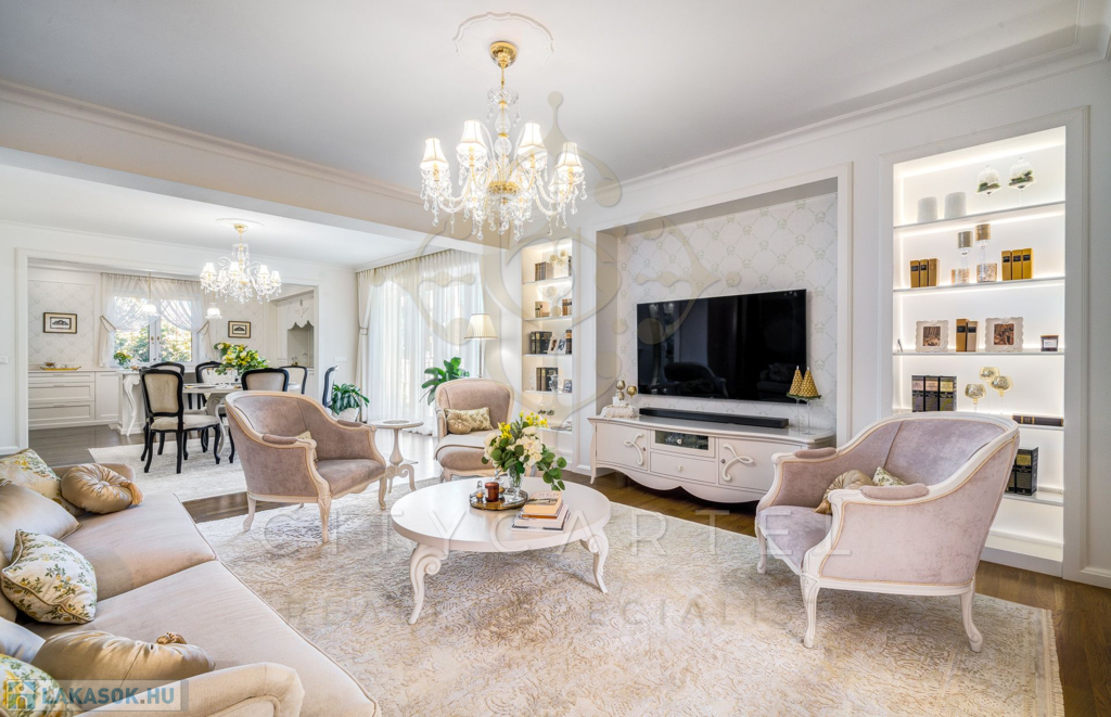 A helyiségek berendezése minden luxusigényt kielégít, ahol az elegáns, aprólékosan kidolgozott modern-klasszikus enteriőr a kifinomult belsőépítészeti és lakberendezői munka tökéletes példája.